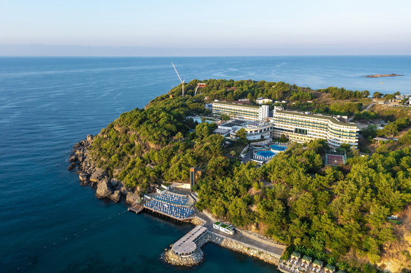 ympäröi taivaansininen Välimeri ja taustalla kohoavat Taurus-vuoret. Koko alue