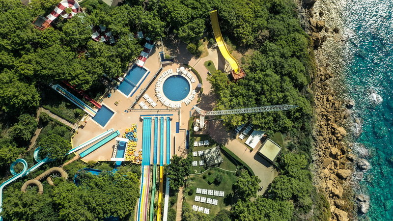rakennuksesta. Valittavana on useita uima-altaita sekä vesipuisto, jossa on