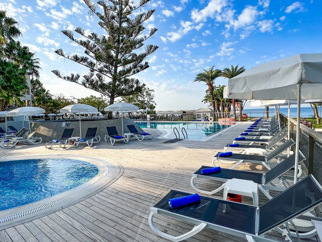 Välimeren suolaisesta vedestä, hotellilla on oma ranta-alue, jossa on