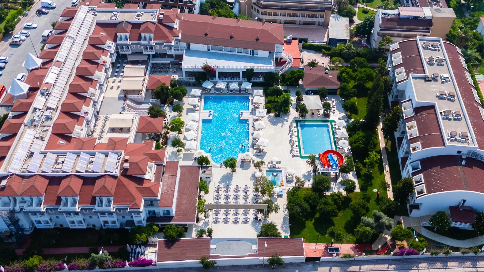 pääallas, allas vesiliukumäillä ja pieni lastenallas. Rannalle pääsee kävellen